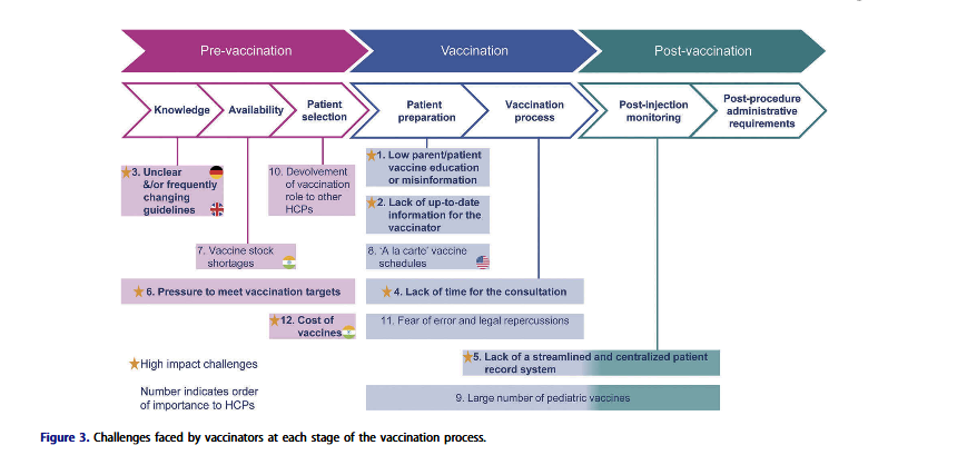 Vaccinators identified challenges during all stages of the vaccination process - from the background period prior to seeing a patient, during the pre-vaccination consultation phase, administration process, and during the period after vaccination. (See Figure 3, above.)