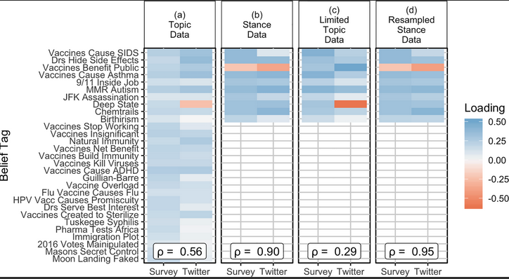 After inferring stance from weblinks in tweets, there was good qualitative and quantitative agreement between the survey and Twitter data. This correspondence improved further after the researchers resampled the Twitter data based on the number of topics an individual tweeted about, as a means of correcting for differential representation for elicited (survey) vs. volunteered (Twitter) beliefs. Overall, the results show that analyses using Twitter data may be generalisable in certain contexts, such as assessing belief covariation. The results also reveal that the levels of health misinformation on social media that have concerned public health officials are not just a manifestation of bots or state-sponsored trolls, as the misinformation distributions observed on social media generally correspond to attitudes in the American population.
