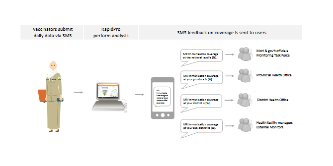 The digital health platform was developed using the United Nations Children's Fund (UNICEF)-designed open source software RapidPro, which was administered at no cost to users. It was intended to be complementary to paper-based reporting, and not a substitute. Immunisation managers and health facility staff were trained in the use of the tool, including through an instructional animated video disseminated through WhatsApp. The trained vaccinators then used personal mobile phones ("smart" or simple) to register their health facility; at the end of each reporting day, they then submitted a text message (SMS) to report the number of children immunised. Data from all facilities were aggregated and visualised with an online dashboard at the district, provincial, and national levels. Vaccinators and programme managers received an automated text message at the end of each day with feedback on progress towards coverage targets for their administrative level.