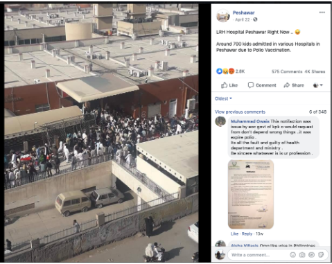 - Misinformation - e.g., "No doubt, social media is the home of false, fraud and futile media outlets bent upon spreading fake news [May 11 2019]." Indeed, some commenters believe there is "no polio in Pakistan" and spread fake content about the vaccine. However, other commenters identified the misleading content and pointed out the false claims about polio and polio vaccination to others.