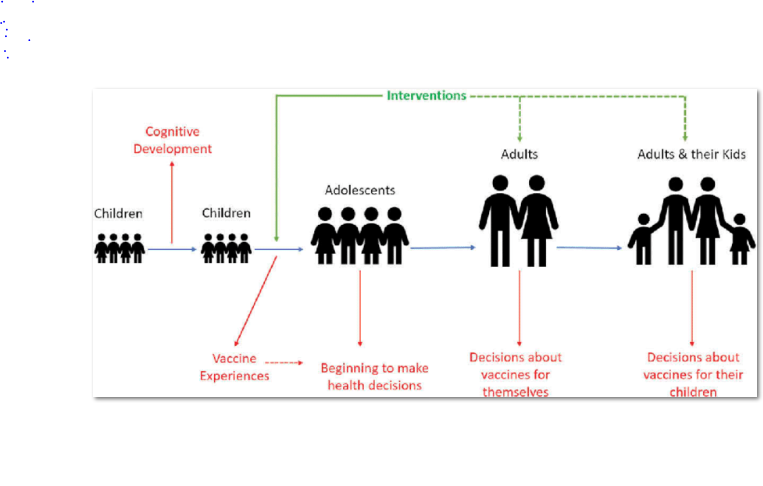 Figure 1 in the paper (and above) explores a concept map for reasons for focusing on children: (i) the importance of childhood cognitive development on formation of core beliefs; (ii) the fact that children's primary experience with vaccination is pain, which can create future vaccine hesitancy; (iii) the prospect that vaccine-hesitant parents could convey their beliefs on their children; and (iv) the reality that involvement in vaccine decision-making is occurring earlier in life due to the increase in adolescent vaccines.
