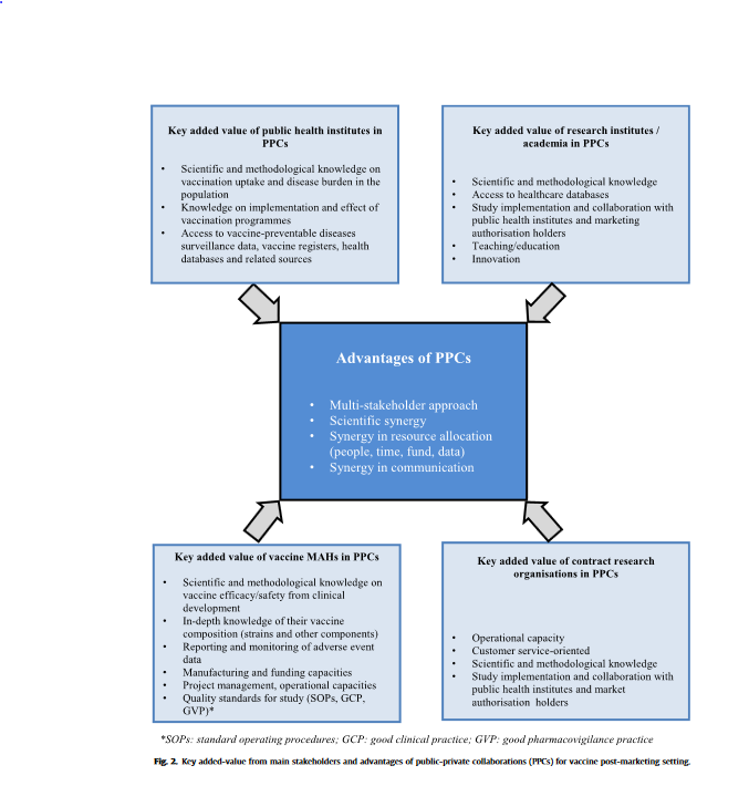 The article offers recommendations for the roles the various partners can play in PPCs. For example: "The active participation of patient associations and civil society organisations is strongly recommended because of their added-value for a productive vaccine post-marketing benefit-risk evaluation, as well as for their support for enhancing transparency and public trust. They could be involved as members of the steering committee (with voting rights or as observers), or as members of the scientific committee or quality control & audit committee for those with the relevant expertise. They could also be involved as independent external experts, e.g., for reviewing project information in external communication material for the lay public."