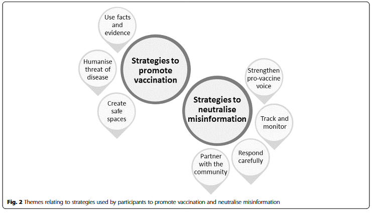 - Strategies to promote vaccination included using facts and evidence, humanising the threat of disease (e.g., through personal stories), and creating safe spaces (e.g., through private messaging and closed Facebook groups).