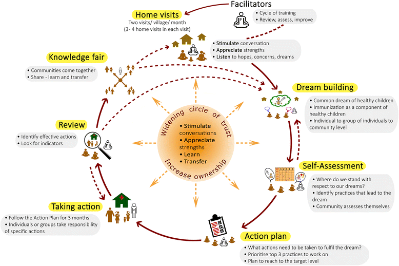 - This is followed by the action phase and the review process. The emphasis is that a plan is used to help take action, with actions taking precedence. Facilitators then bring communities together to share with and learn from each other in a "knowledge fair", when transfer of knowledge and experience takes place between communities. Depending on the progress and timeline allotted for the intervention, the community might revisit the dream and the various steps in the process.