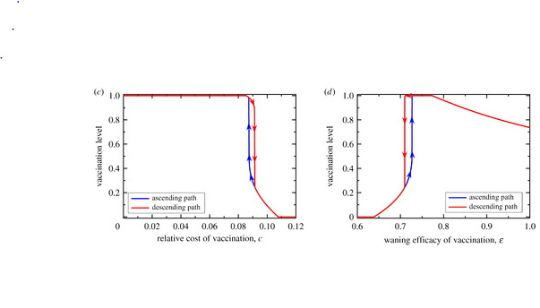 The researchers explain that the perceived cost or effectiveness of vaccination may be determined by a concurrent dynamic of social contagion that governs the changes in public perception of vaccination risk or vaccine beliefs. In the electronic supplementary material, they show that incorporating co-evolving vaccine attitudes into vaccination dynamics can strengthen the hysteresis effect, further hindering the recovery of vaccine uptake.
