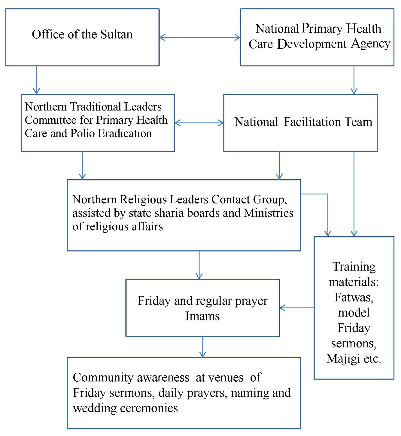 As explained here, in 2008, the National Primary Health Care Development Agency pilot-tested a polio mobilisation campaign involving a community communication and awareness enhancement methodology known as Majigi (a roadside film show) in Gezawa, Kano State, located in northwestern Nigeria. The participation of imams was solicited through traditional rulers; active participation of traditional rulers in PEI in northern Nigeria became a reality after the Sultan (the current Muslim spiritual leader in Nigeria, with a strong influence on the dominant Muslim community of the region) supported the programme. The encouraging outcomes of the Majigi campaign led to the formal launch of the Northern Traditional Leaders Committee for Primary Health Care and Polio Eradication in 2009 by the Sultan.