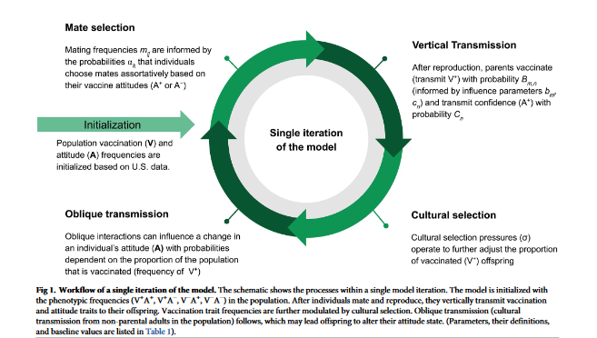 For a population of individuals, the researchers track the status of vaccination coverage and vaccine confidence over time; within this population, individuals mate, decide whether to vaccinate their offspring, and transmit a vaccine attitude trait. Each individual in the model has a vaccination (V) trait, either V+ (vaccinated) or V- (unvaccinated), and an attitude (A) trait, either A+ (vaccine confident) or A- (vaccine hesitant), resulting in four possible phenotypes (V+A+, V+A-, V-A+, and V-A-). To model the effects of the external factors, the researchers assume that vaccine mandates and inaccessibility both act to reduce the influence that internal factors, such as individual beliefs, have on vaccination behaviours.