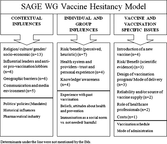 - In terms of contextual influences, religious beliefs were often a causal factor in vaccine hesitancy (cited by 9 IMs). Several IMs were able to specifically identify religious groups in their country that were known to be opposed to all vaccines, while others discussed "religious reasons" without specifying a religion or a group. Causes of vaccine hesitancy linked to the "communication and media environment" were identified by 5 IMs. Two IMs spoke broadly about "rumours and misconceptions" regarding vaccination circulating in their country, and 3 directly identified negative information conveyed in the mass media (television and internet) as causes of vaccine hesitancy. Geographic barriers and hesitancey seen among those without an official status were also mentioned.