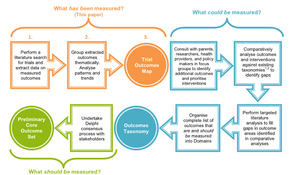 In November 2013, the researchers searched the Cochrane Central Register of Controlled Trials (CENTRAL) for trials of childhood vaccination communication interventions, identifying 112 relevant trials containing 209 outcomes. (Included were trials written in English (randomised, quasi randomised, or cluster controlled) that evaluated a communication intervention, focused primarily on a vaccination population of children up to 6 years of age, addressed routine childhood vaccines only, and reported communication which was addressed to caregivers or community members (communication interventions directed to health professionals were not included unless they specifically impacted the encounter between the provider and parents. This focus reflects the scope of the COMMVAC project.) Thematic analysis revealed 3 overarching outcome categories: (i) consumer-related (i.e., outcomes relevant to the thoughts, feelings, experiences, and decision making of parents or community members), (ii) vaccination-related (i.e., outcomes assessing changes in vaccination status or behaviour), and (iii) health-system-related outcomes. These categories contain 21 outcome types (the concepts being measured - e.g., "knowledge"), measured using 66 different outcome variables (the ways in which different trials define and measure outcomes).