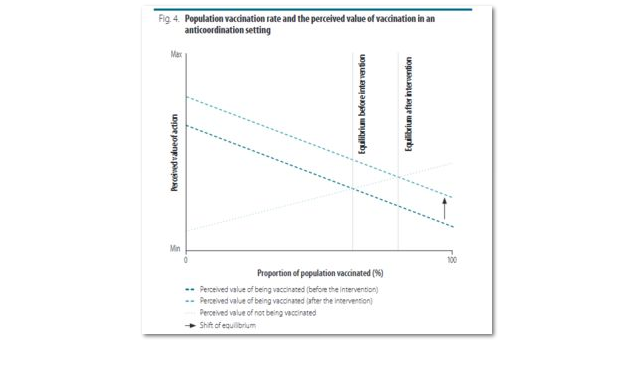 The example of vaccination campaigns illustrates how underlying incentive structures can interfere with the indirect effect of an intervention and stall efforts to scale up its implementation. In short, public health professionals generally aim to increase the proportion of vaccinated individuals in the population beyond the threshold for herd immunity; social influence may support them in this endeavour. However, once a certain proportion has been vaccinated, anticoordination incentives can favour opting out of vaccination. Namely, the perceived value of vaccination may decrease as the number of people vaccinated increases (the risk an unvaccinated person will catch the disease declines as vaccination becomes more widespread). The perceived cost of contracting the disease when unvaccinated must be balanced against the possible fixed costs of vaccination, including fear. Once enough people have been vaccinated to ensure that, for the unvaccinated, the perceived value of not getting the vaccine exceeds the perceived value of vaccination, the proportion of people vaccinated will reach a stable equilibrium.