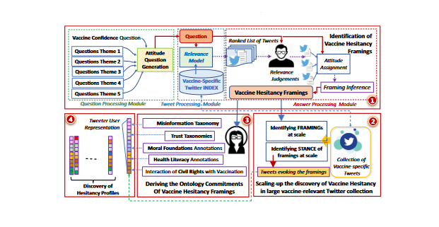 The study is based on 422,078 tweets discussing the HPV vaccine authored by 192,487 users and 5,865,046 tweets discussing the COVID-19 vaccine authored by 2,268,358 users. In Step 1, the researchers identified the vaccine hesitancy framings for either the HPV or COVID-19 vaccines as answers to questions asking about confidence in vaccines. Step 1 of the method produced 113 framings (COVID-19) and 64 framings (HPV), which answer research question 1 (RQ1): How is confidence in the HPV and the COVID-19 vaccines framed in the Twitter discourse? One key finding (see Figure 3 in the paper for more): Misinformation is pervasive in the framing of confidence in the HPV vaccines. Step 2 scaled up the discovery of vaccine hesitancy by automatically discovering (a) all the tweets that evoked any of the hesitancy framings identified in Step 1 and (b) the stance of the tweet author towards the framing.