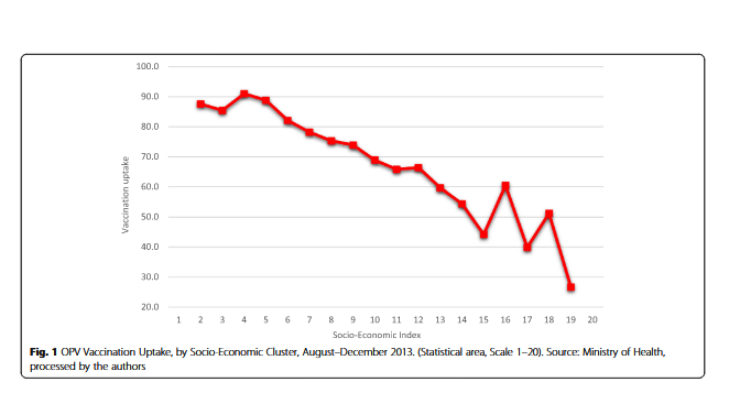 The central finding of the study is that the higher the SES level of the municipality where the mother-and-child clinic is located, the lower the OPV vaccination uptake is. The greater the income inequality is (Gini index) in the municipality where the mother-and-child clinic is situated, the lower the vaccination uptake. Put another way: "This study shows that in communities that are stronger socio-economically, there is less inclination for parents to ensure that their children are vaccinated. Additionally, in municipalities where there are smaller economic gaps and community members are more similar in SES status, there is a greater tendency to vaccinate their children against polio."