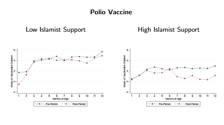 Based on this evaluation, the researchers estimate that a one standard deviation increase in the support for Islamist groups led to a 12-20% reduction in the immunisation rates of fully-exposed children in comparison to not-exposed cohorts. This one standard deviation increase in support for Islamist parties is associated with one extra case of poliomyelitis per year, which is equivalent to a 93% increase over the sample mean. They also provide suggestive evidence (see especially Appendix Table 13) that the reduction in the demand for vaccines is likely to be driven by the ideological affinity to Islamist groups and not by fear or intimidation of the Taliban. The results are highly statistically significant and robust to the inclusion of various controls, including district and monthly-cohort fixed effects. Furthermore, the researchers provide evidence that supports the absence of pre-existing trends preceding the disclosure of the vaccination ruse. These results are consistent with the hypothesis that the disclosure of the vaccine ruse damaged the reputation of vaccines and formal medicine, more generally.